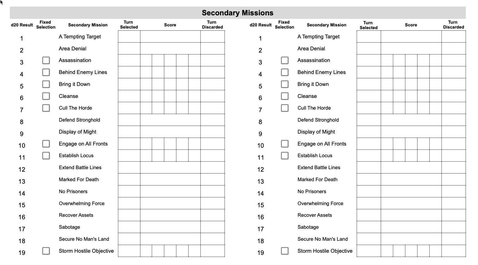 Like clocks, having a transparent and consistent way to generate secondaries levels the playing field during a game. We’ve all seen a stray card laying on the ground during a game day or tournament – how are you supposed to verify your opponent not only has the right number of secondary cards but also each one is correct? With an app, how are you supposed to verify when they’re clicking around that they aren’t tapping through a garbage secondary to get one they want? We’re going to eliminate all that by sticking with a dice-based secondary generation system using a d20 from our friends over at Gamescience . Roll dice, get secondary – easy peasy.